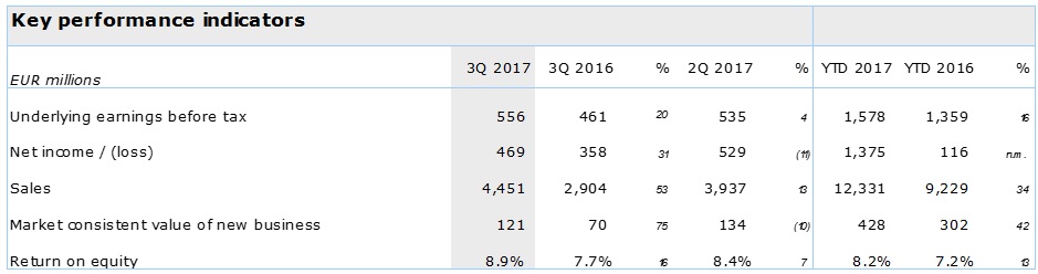 Net income increased by 31% compared with the third quarter of last year to EUR 469 million, as higher underlying earnings, fair value items and realized gains more than offset an increase in other charges driven by the conversion of the largest block of universal life business in the United States to a new model.